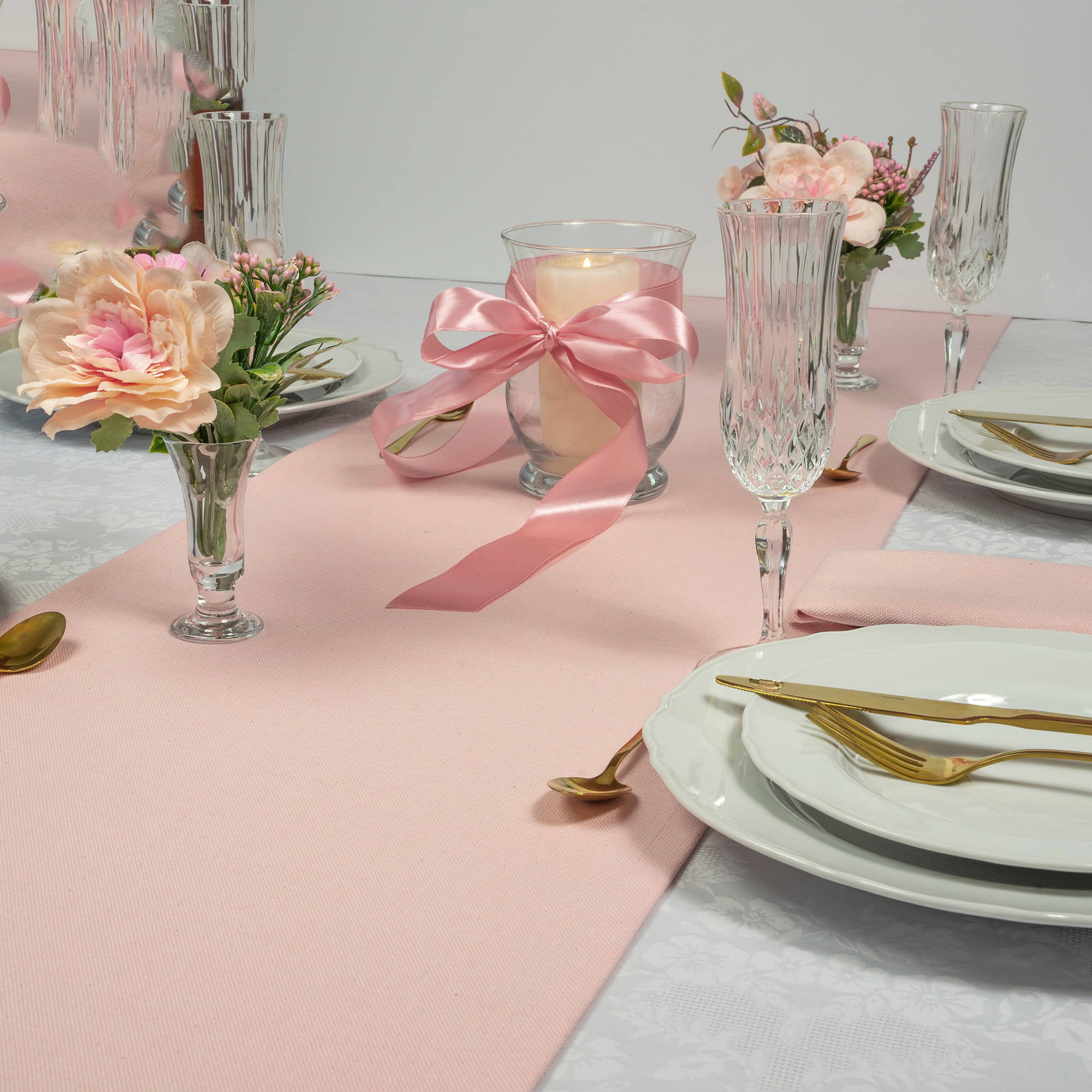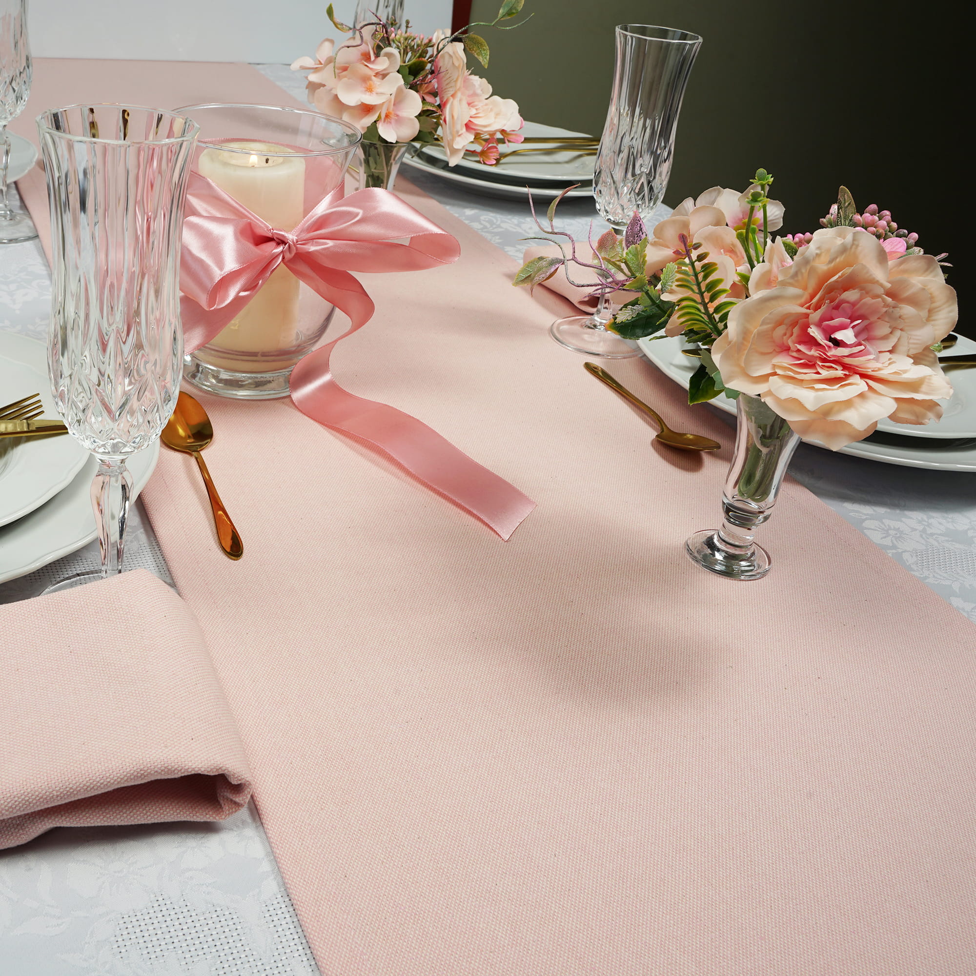 Przedmiotem oferty jest Bawełniany Bieżnik w pastelowym różowym kolorze uszyty w naszej pracowni.