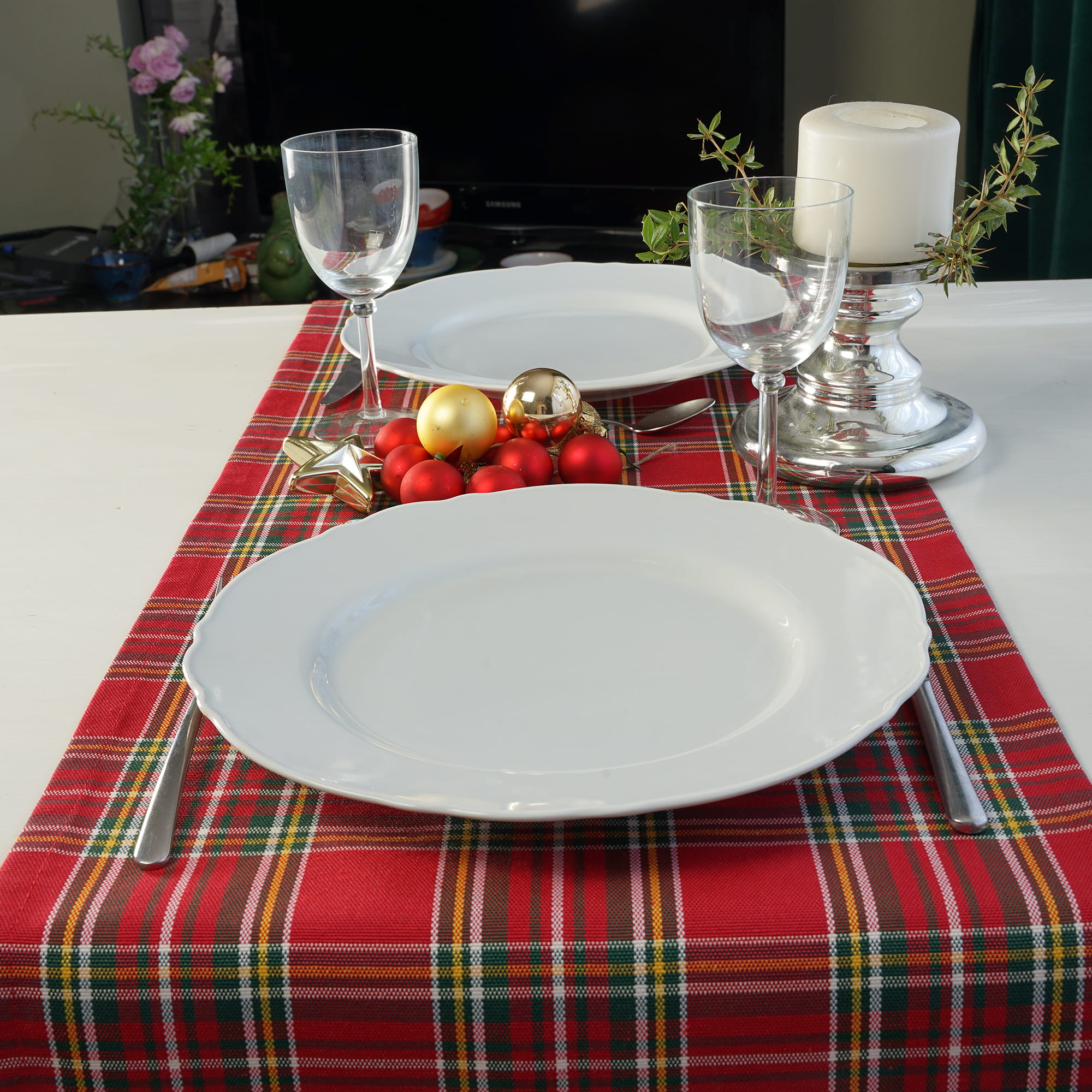 Klasyczny wzór w czerwono-zieloną kratę natychmiast przywołuje na myśl ciepłe, rodzinne święta Bożego Narodzenia, dodając stołowi uroku i przytulności.