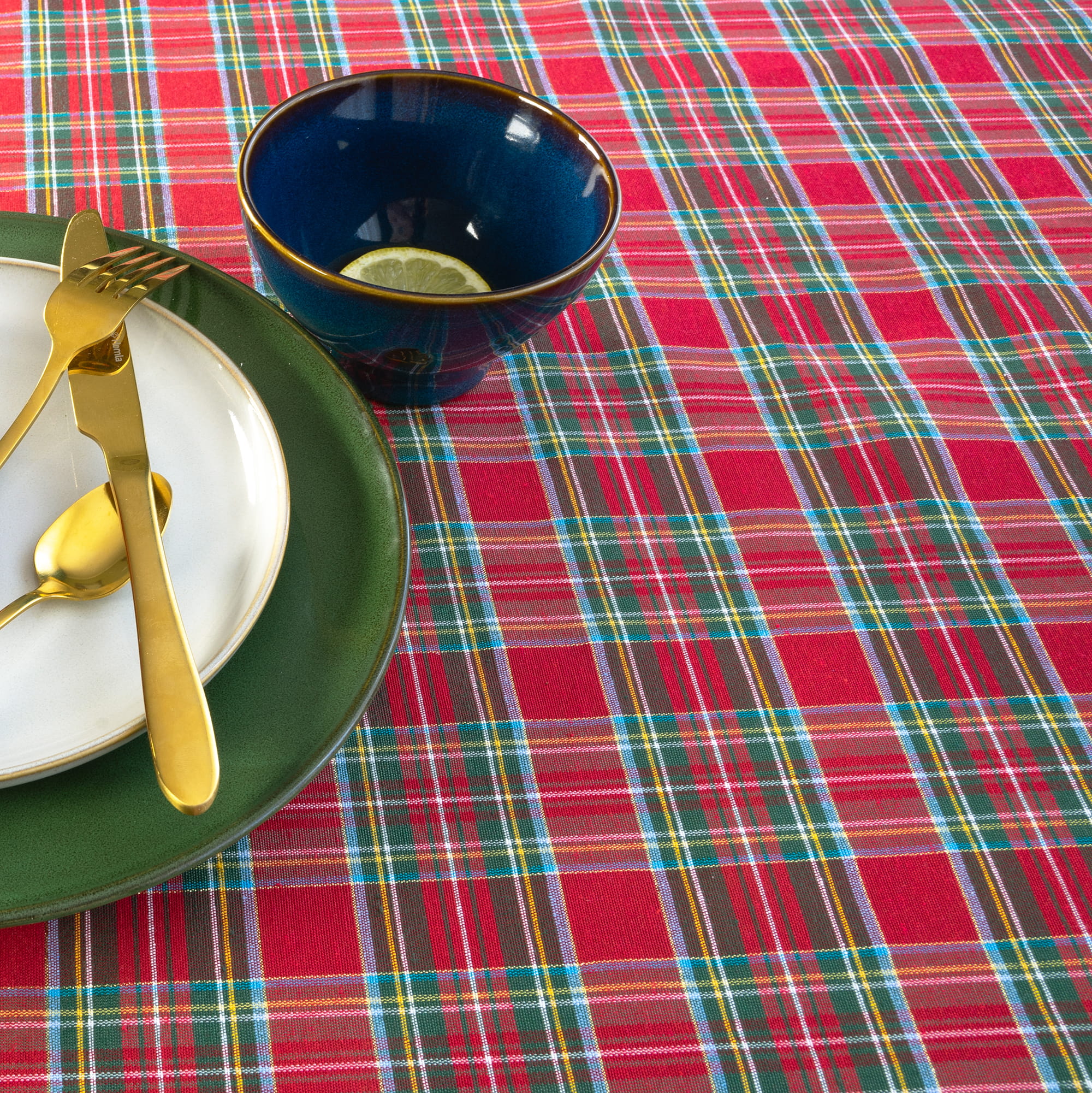 Kolor i wzór: Klasyczna czerwona krata z delikatnym złotym akcentem, który pięknie odbija światło, tworząc wyjątkowy efekt podczas świątecznych posiłków.