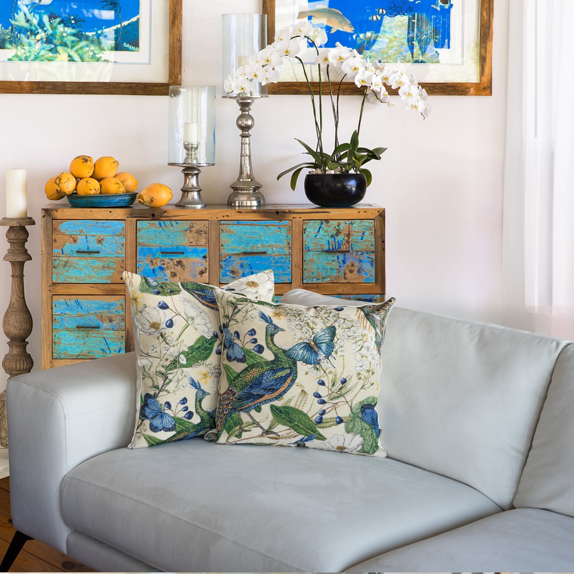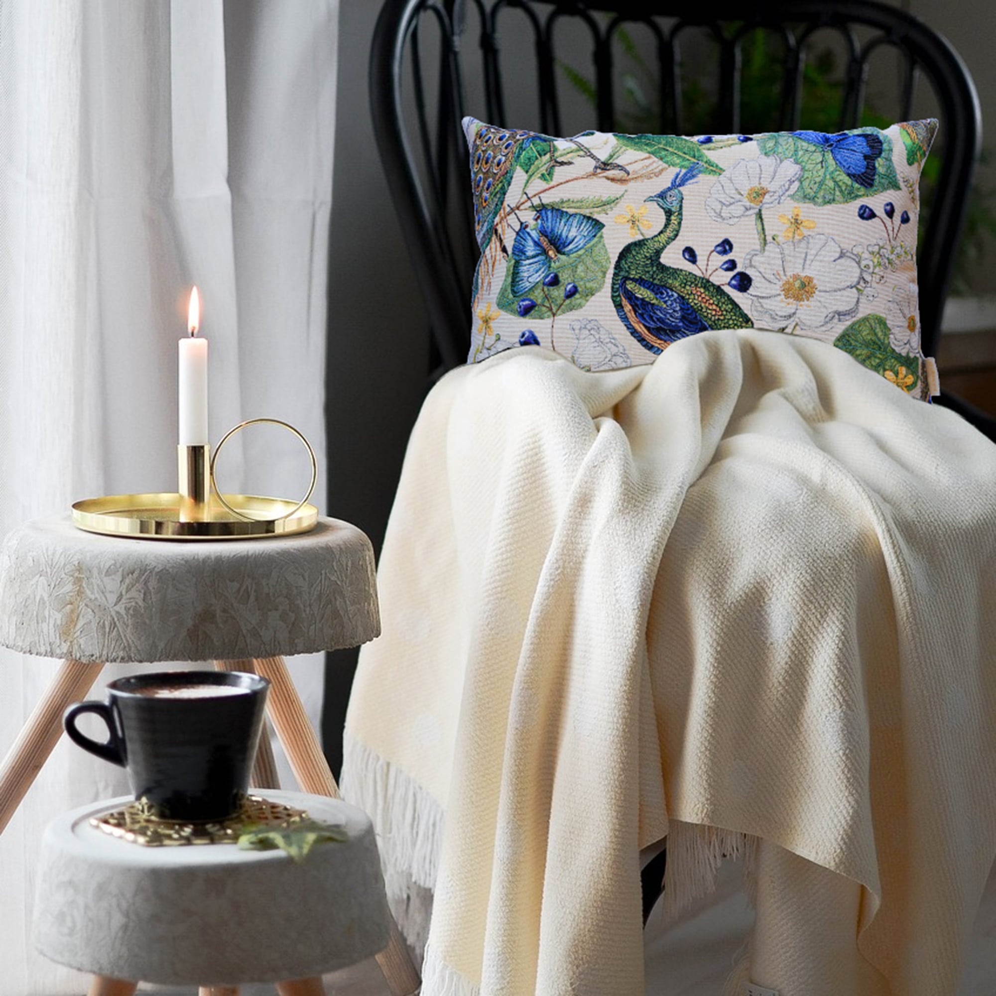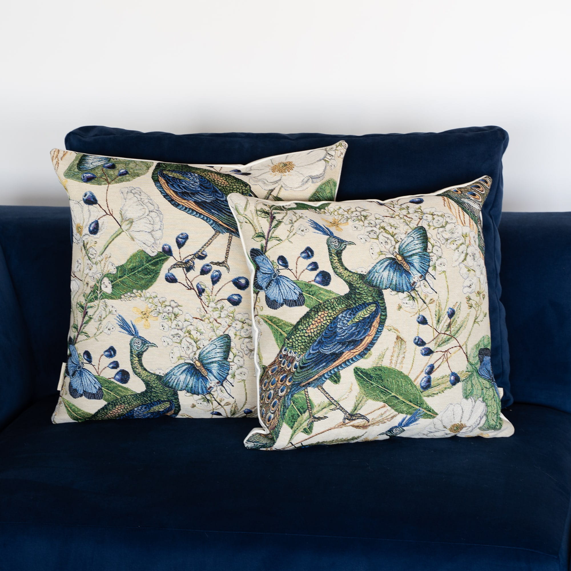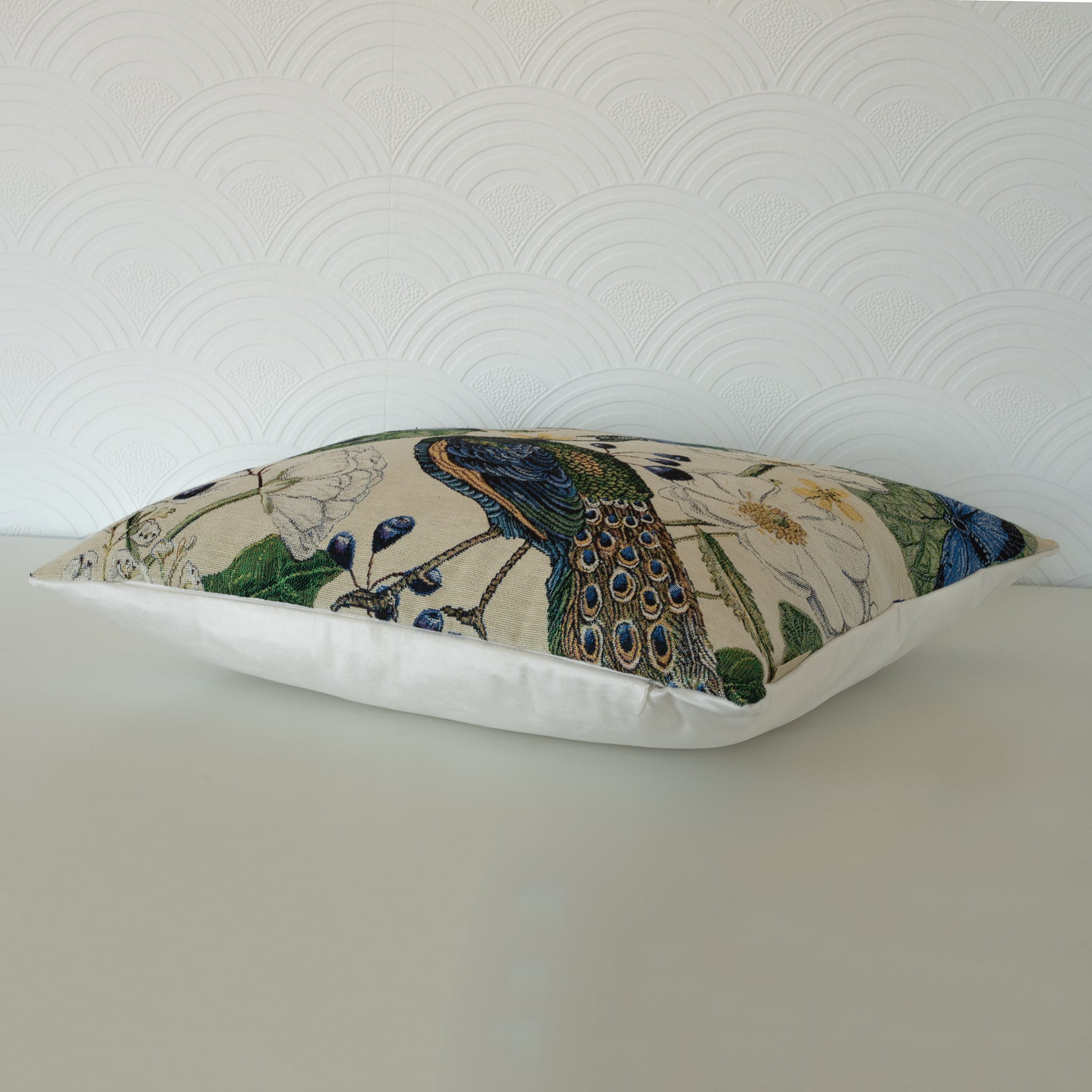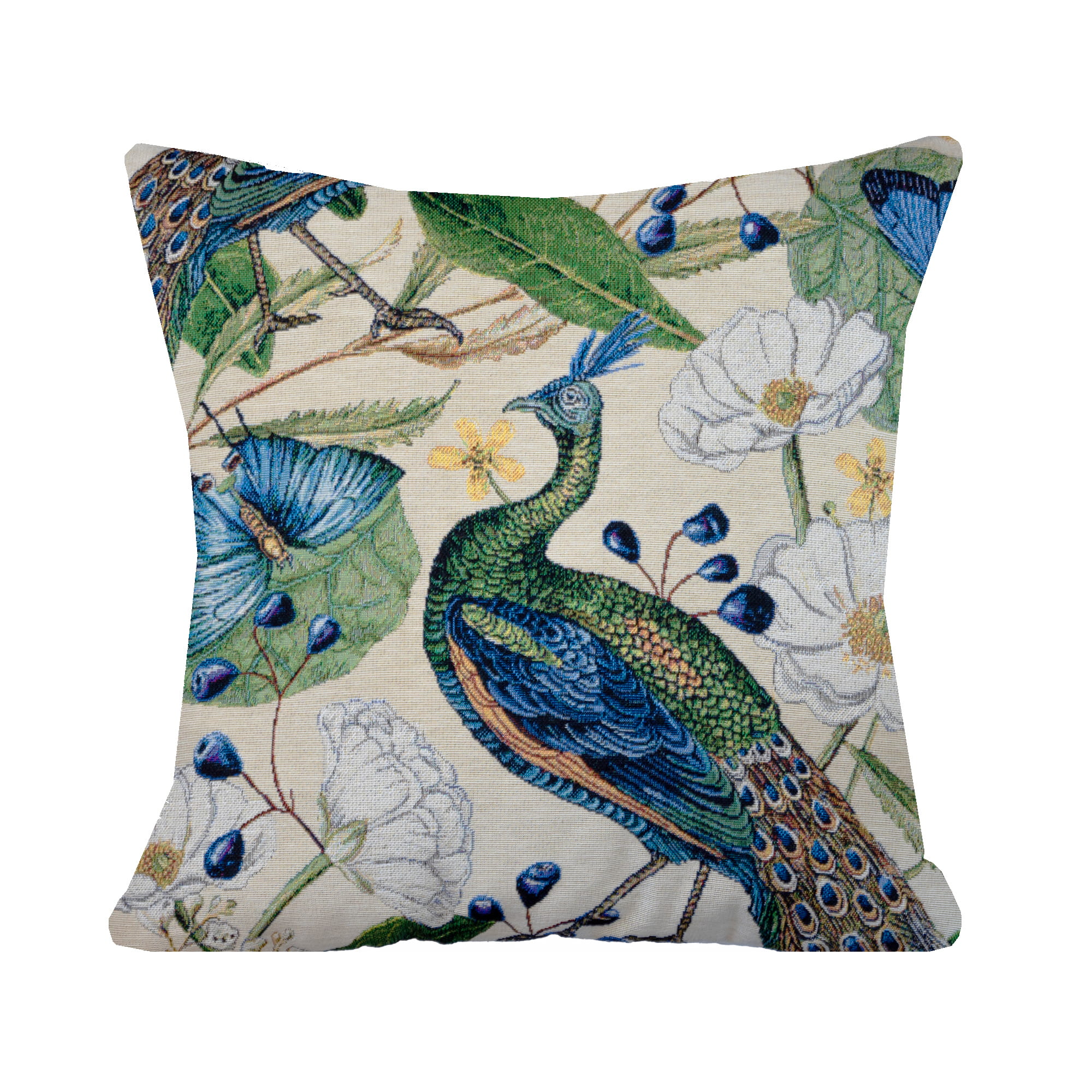 Uszyta z gobelinu klasy Premium, zachwyca pięknym, niepowtarzalnym wzorem oraz trwałością materiału. Dekoracyjny front przedstawia kunsztowny wzór pawia otoczonego kwiatami anemonów, precyzyjnie utkany techniką gobelinową.