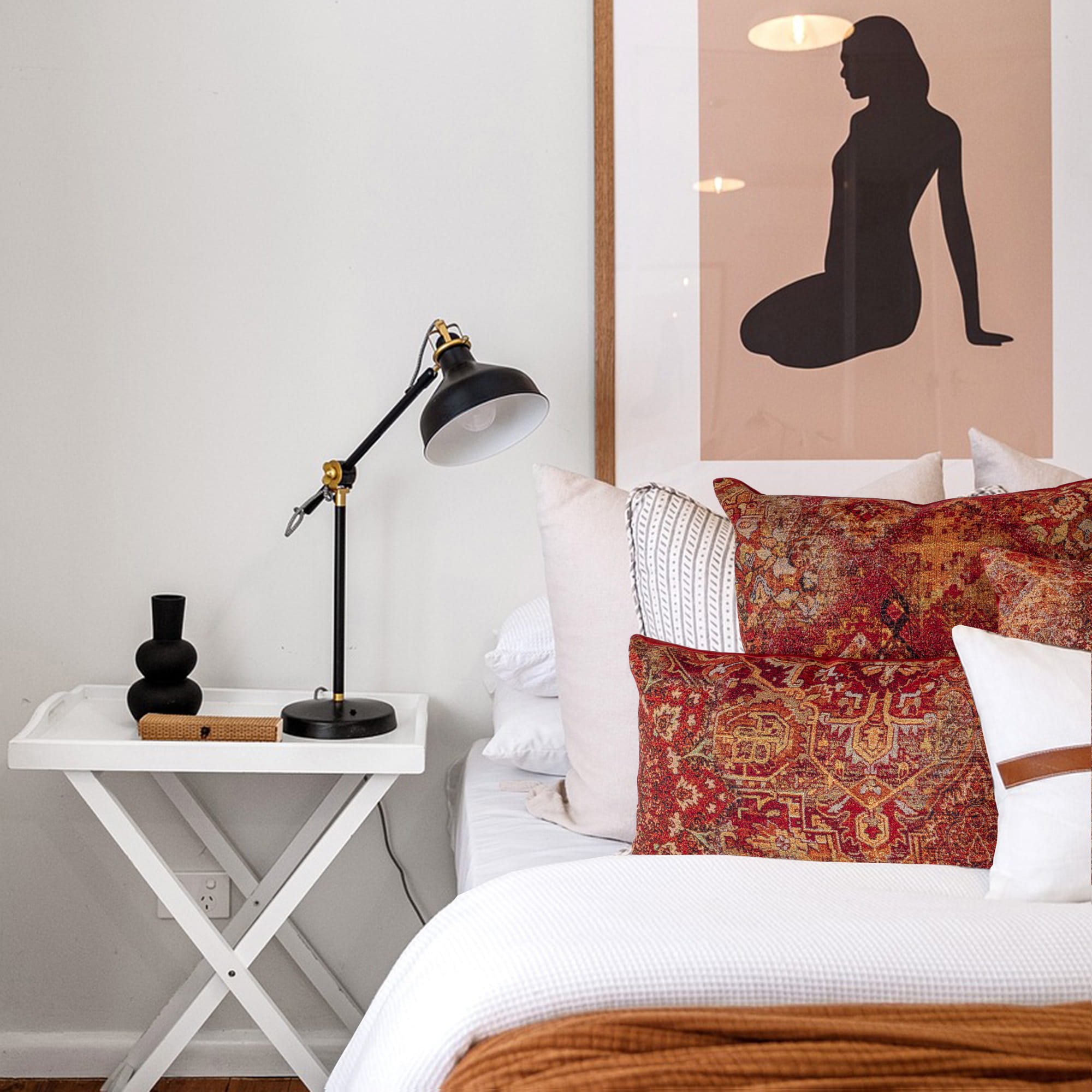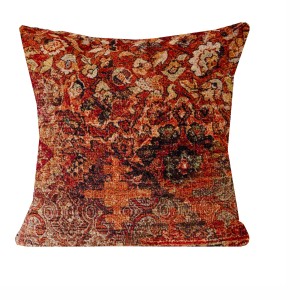 Poszewka dekoracyjna o orientalnym wzorze, uszyta w kolorach ceglanej czerwieni i głębokiej czerni, jest wspaniałym dodatkiem do każdego wnętrza, które pragnie ożywić swoją atmosferę egzotycznym akcentem.